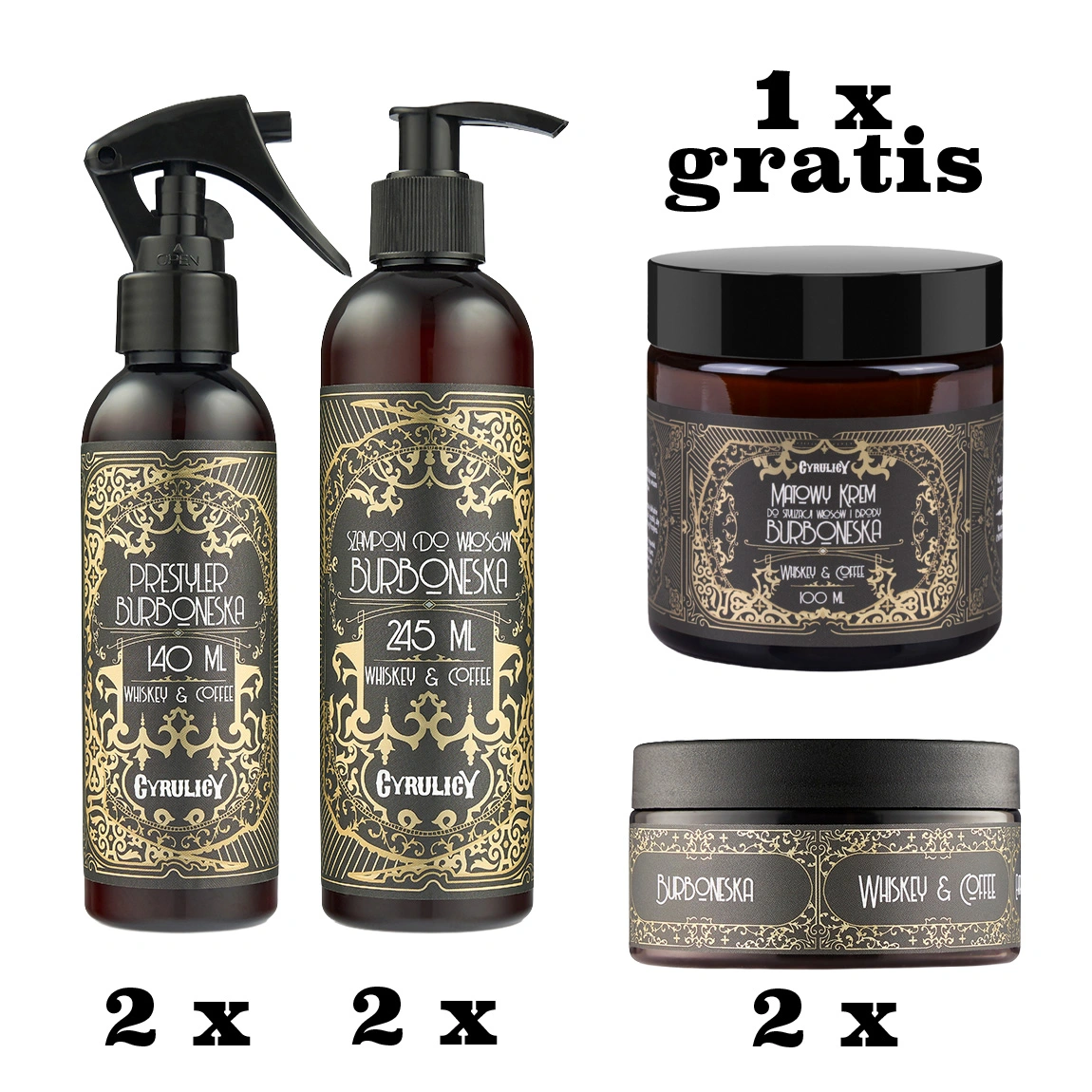 Barberski zestaw do włosów Burboneska (2 x prestyler, 2 x szampon do włosów, 2 x pomada-glinka + 1 x krem do włosów i brody gratis) – w skrócie