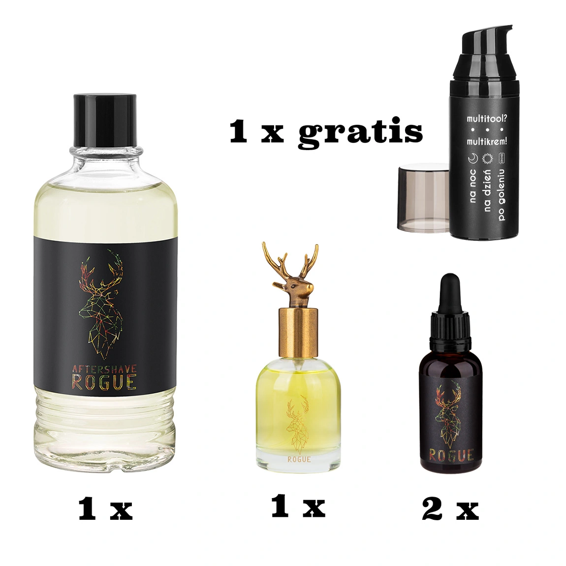 | Zawartość | 1× Aftershave Rogue 400 ml, 2× Olejek do brody Rogue 30 ml, 1× Parfum Rogue 50 ml, 1× Krem po goleniu Multikrem 50 ml (gratis) |